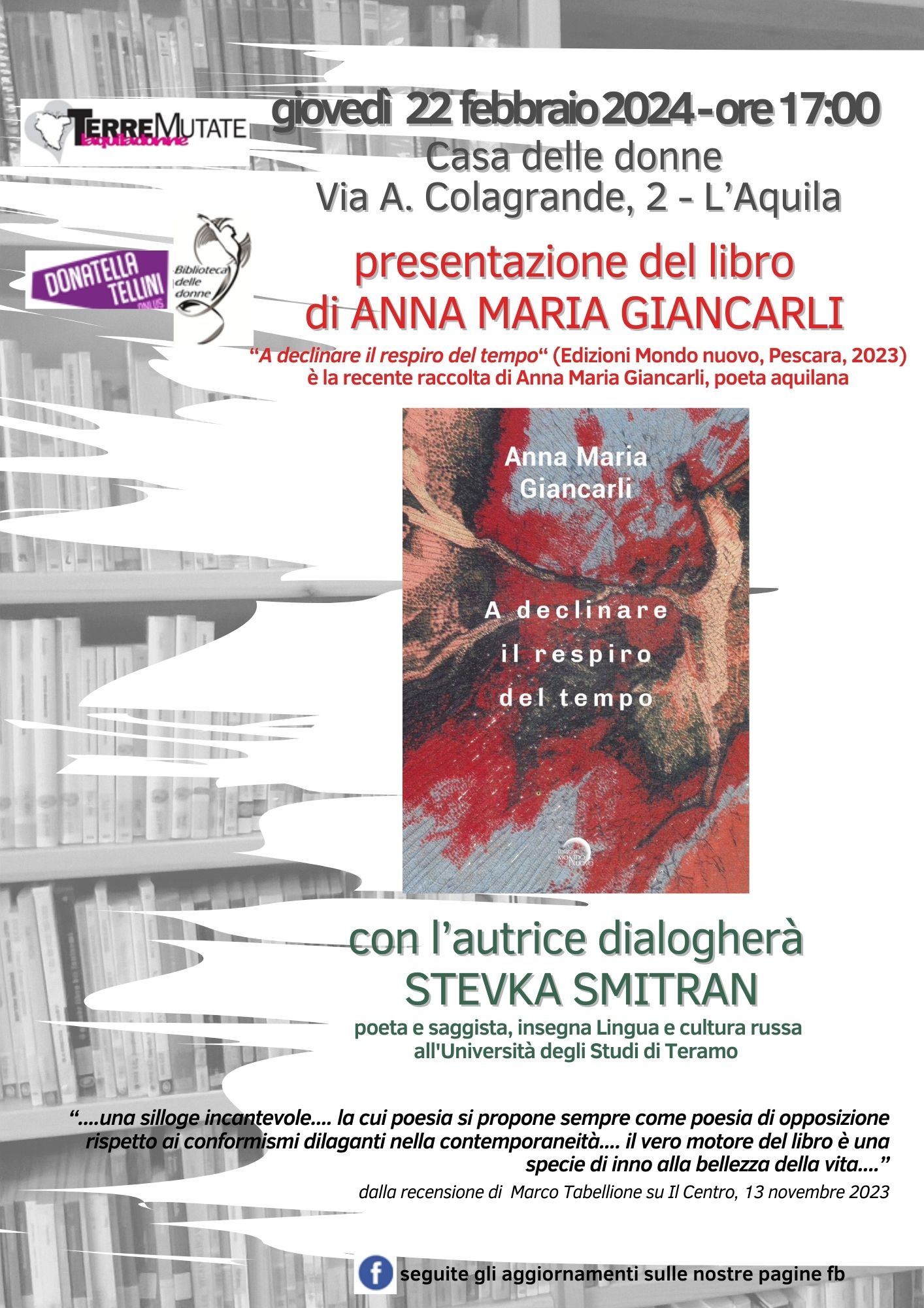 Le Associazioni Donne TerreMutate e Donatella Tellini/Biblioteca hanno organizzato, in data 22 febbraio a L’Aquila Casa delle Donne, la presentazione della recente raccolta di poesie di Anna Maria Giancarli dal titolo “A declinare il respiro del tempo”, Edizioni Mondo Nuovo 2023. Ha dialogato con l’autrice la poeta e saggista Stevka Smitran.